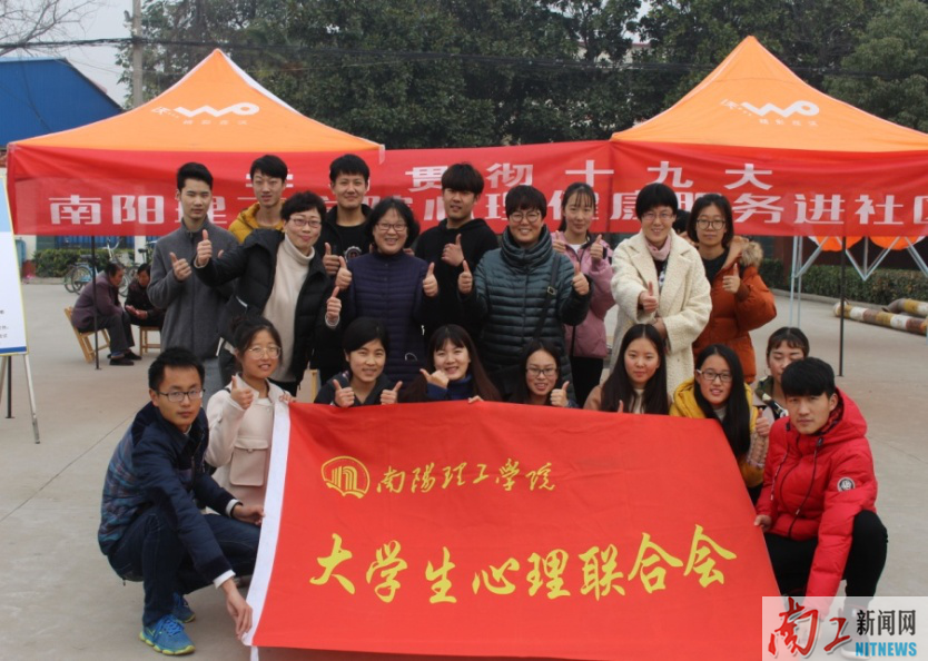 为深入学习贯彻党的十九大关于“加强社会心理服务体系建设,培育自尊自信、理性平和、积极向上的社会心态”报告精神,关注周边社区居民心理健康,充分发挥高校知识资源优势服务于社会,11月28日上午,南阳理工学院心理健康教育中心党支部组织党员教师、理工社区科教师、大学生心理联合会的志愿者们在枣林街道文化广场开展了心理健康知识普及、现场心理咨询活动。