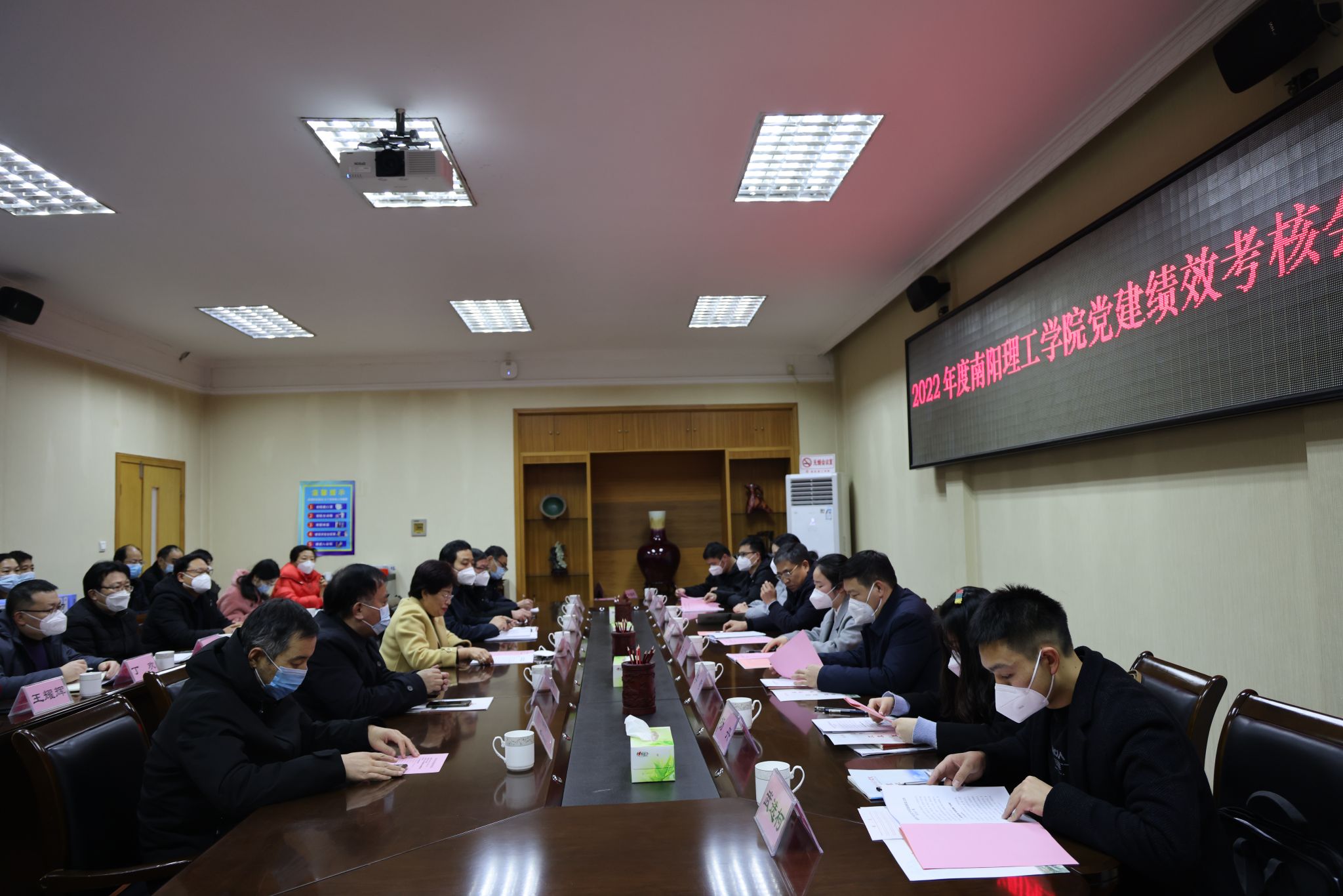 1月11日下午,南阳市委考核组一行8人来校考核2022年度高质量党建工作。汇报会在第一会议室召开,校党委书记刘荣英,党委副书记、工会主席董豪出席会议,党政办公室、党委组织部、党委宣传部、党委统战部、纪委监察专员办公室、党委保卫工作部、团委有关负责同志参加会议。