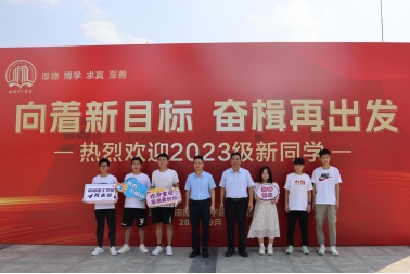 在齐贤广场“向着新目标 奋楫再出发”迎新展板前,校领导同2023级新生进行合影留念。